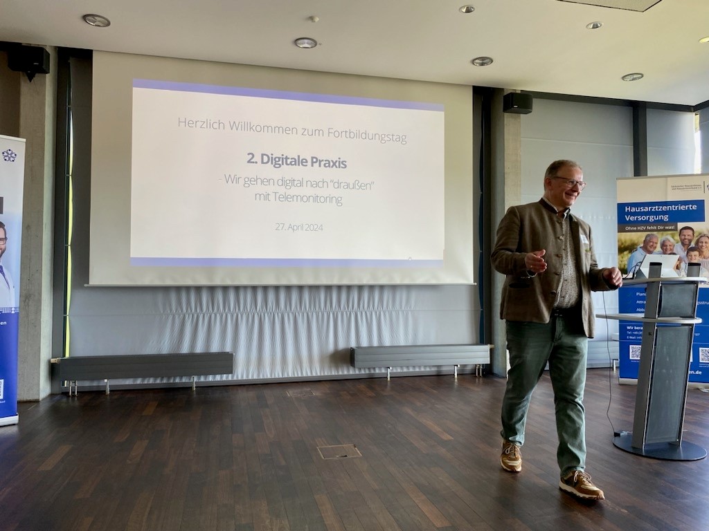 Nach einer kurzen Einführungsrunde folgten vier Fachvorträge mit Erfahrungsaustausch und praktischen Anwendungen. Expertinnen und Experten im digitalen Bereich beleuchteten zum Beispiel die Online-Terminvergabe, Videosprechstunden sowie die Anwendung und Verordnung von DiGA (Stichwort: Apps auf Rezept) in der hausärztlichen Versorgung.